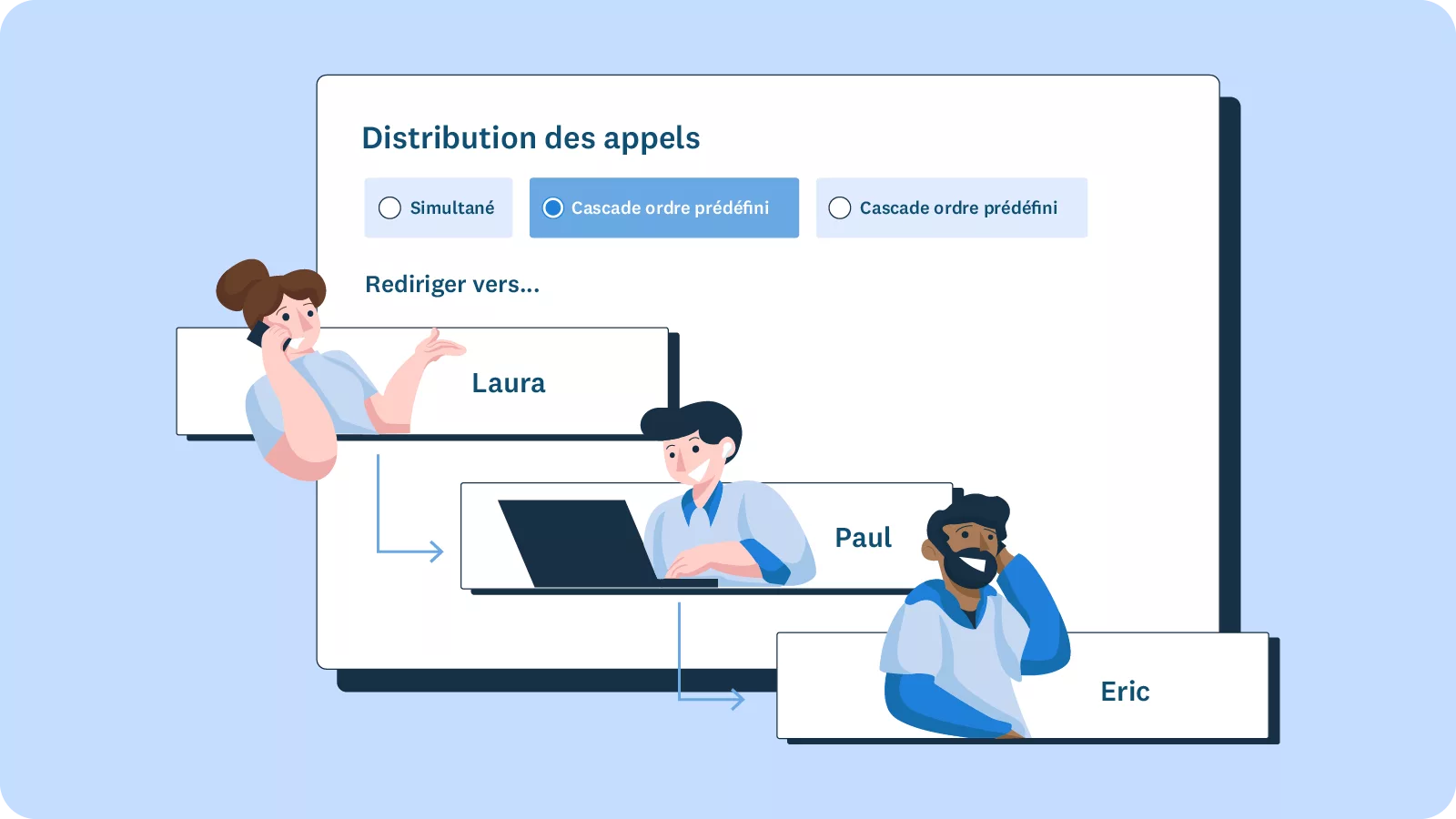En cascade avec ordre prédéfini : définissez une hiérarchie entre les utilisateurs et ils sonneront les uns après les autres selon un ordre fixe (par exemple, c'est toujours Pierre qui reçoit les appels en premier, puis Aline si Pierre ne répond pas, etc). C'est la méthode qui vise à prioriser certaines personnes qui répondent aux appels.