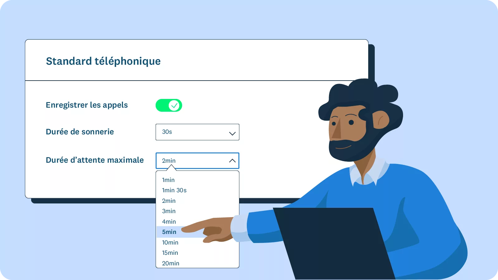 Quicktalk vous permet de gérer la durée maximale d'attente téléphonique. Par défaut, celle-ci est établie à 2 minutes, mais vous pouvez bien sûr la modifier à tout moment d'un clic.